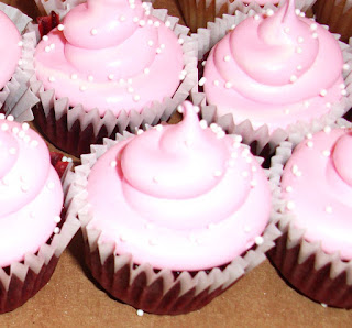 Sweet little Mini Strawberry & Red Velvet CupCakes with Swirls of Pink Vanilla Butter Cream Frosting...